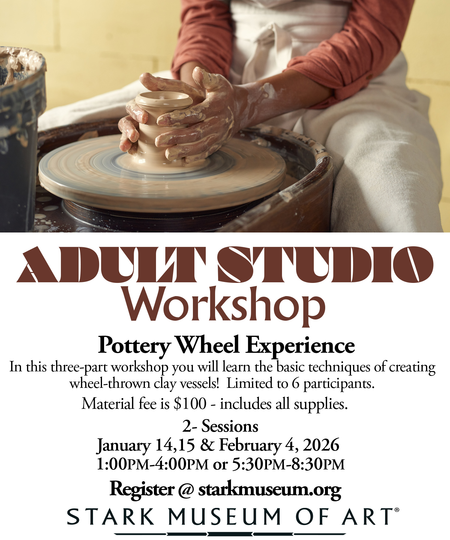 Join us for the Adult Studio Workshop: Pottery Wheel Experience and learn the basic techniques of creating wheel-thrown clay vessels! In the first two sessions (January 14 & 15), you'll create your own pottery pieces on the wheel, which will be fired between classes. During the third session (February 4), you'll add the finishing touch by glazing your pieces.